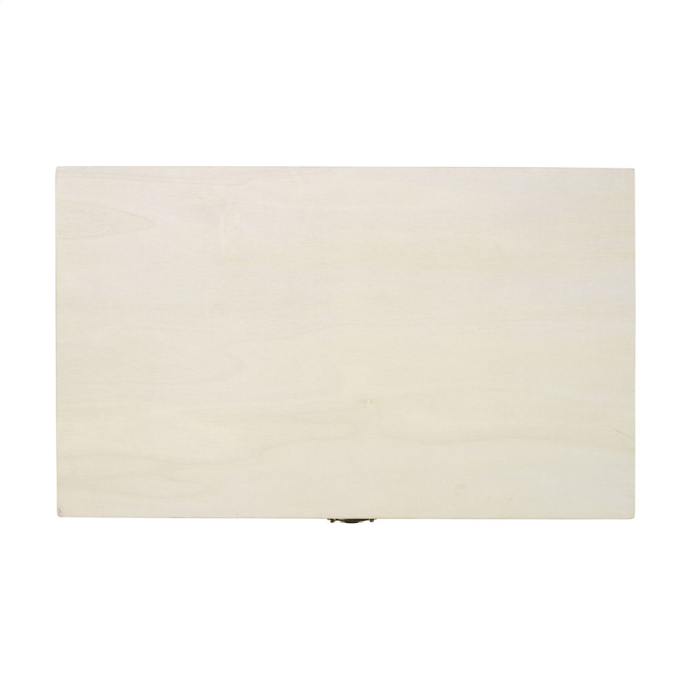 Backgammon game. Includes wooden playing pieces and 2 wooden dice. The box, with the image of the playing board on the inside, is made from FSC 100% certified pine wood. Incl. instructions. Packed individually.