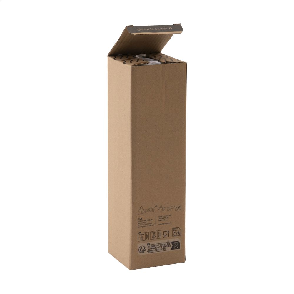 Slim, leak proof water bottle made of soda-lime glass with stainless steel screw cap. With neoprene sleeve to carry the bottle comfortably. The glass bottle is dishwasher safe with the exception of the screw cap. Capacity 750 ml. Packed individually.