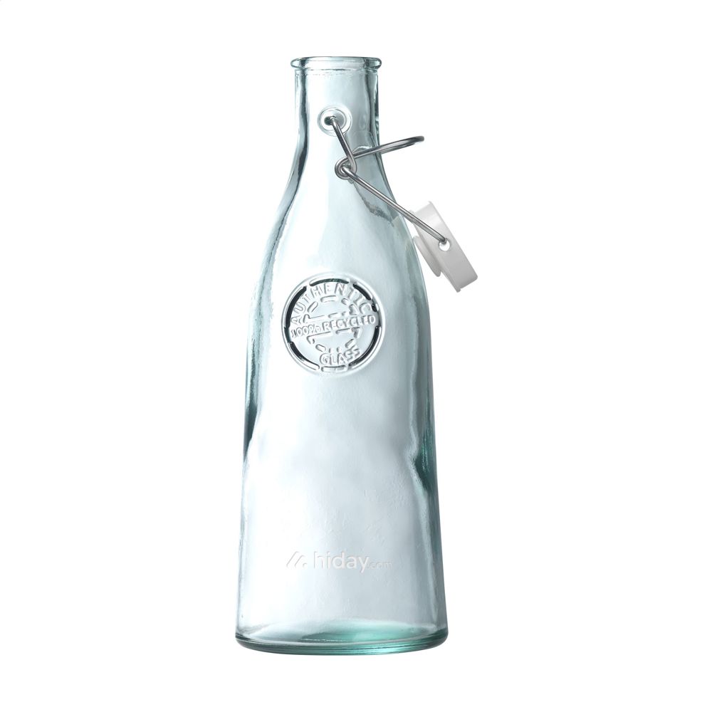 Decorative swing-top bottle. Made from 100% robust recycled quality glass. Lockable with a clip clap. An attractive table bottle with character. The glass is embossed with the 'Authentic Glass 100% recycled' label. The blue-green tint of this glass is a natural result of the recycling process. The colour and any imperfections emphasise the beauty of this recycled product and contributes to its authenticity. Recycling reduces the consumption of new raw materials, water and energy. Colour, thickness and size may vary by product. Made in Spain. Capacity 1,000 ml.