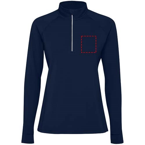 Long-sleeve technical raglan sweatshirt for women. Slim-fit. Collar with a half zip inverted design featuring reflective details. Reinforced seam covers. Cuffs with thumb openings. Reflective details on the back. Back hem slightly longer than the front. Warm brushed inner fabric.