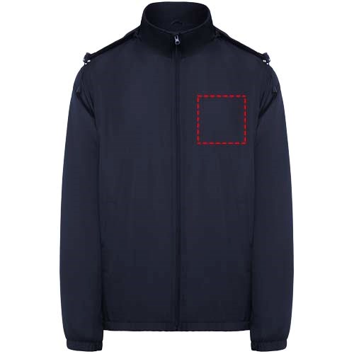 Light waterproof jacket. High collar and foldable hood with adjusters. Microfleece lining. Front zip and chin protector. Elastic cuffs. Two side pockets with zip. Interior left chest pocket. Removable label. Waterproof. Wind-proof. The male model is 184 cm and is wearing size L, and the female model is 174 cm and is wearing size S.
