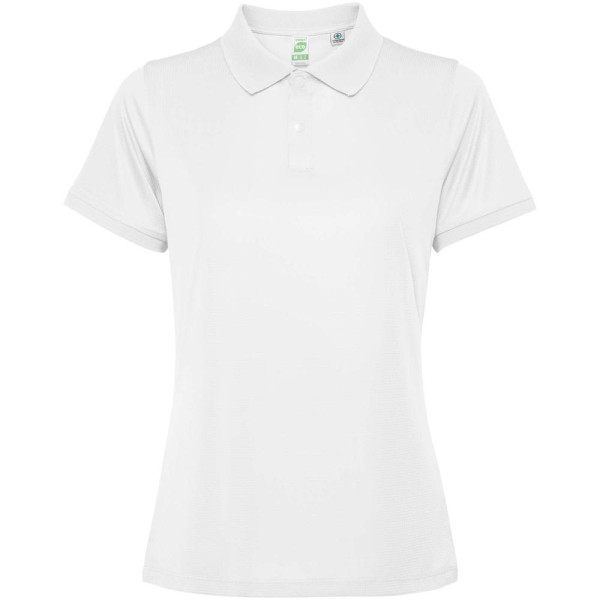 Short-sleeve fitted polo shirt for women. Reinforced covered seams in interior collar. 1x1 ribbed cuffs and collar. Side seams. 3-button placket and side slits.