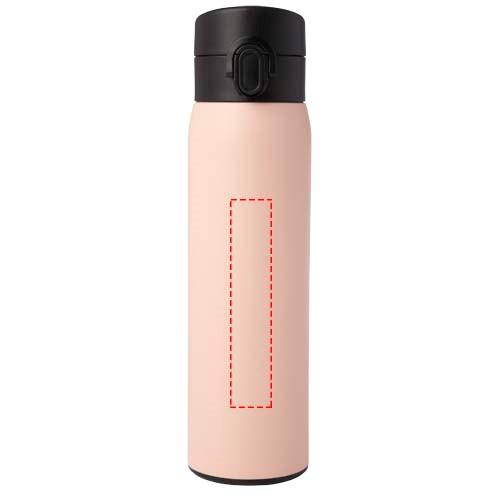 Stylish, RCS certified recycled stainless steel insulated flask with an easy button opening mechanism. The flask is leakproof, and with its copper vacuum insulation drinks will be kept hot or cold for several hours. Volume capacity is 450 ml. Presented in a recycled cardboard gift box.
