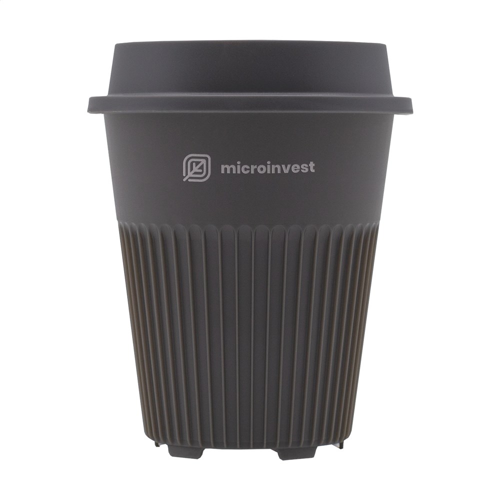 Reusable coffee-to-go cup with lid from the Circular&Co brand. Made from 100% recyclable, sturdy PP. This stackable cup not only looks attractive, the design also puts the focus on functionality. The ribs disperse the heat of the drink and provide a comfortable grip. In addition, the cup has a quick-dry base. The lid with drinking opening prevents spills. Fits into the standard drink holder of cars, so perfect for on the road, but also as a cup at the coffee machine. The perfect alternative to the disposable coffee cup. This cup lasts more than 500 wash cycles and is recyclable up to 6 times. After only 2 uses, the CO2 emissions of the coffee-to-go cup are offset compared to a single-use alternative. This means huge amounts of CO2 never reach our atmosphere. By switching to a reusable cup, billions fewer cups will end up in landfills. Top rack dishwasher safe only. Capacity 340 ml.