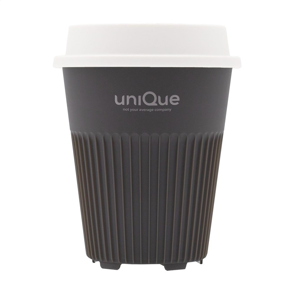 Reusable coffee-to-go cup with lid from the Circular&Co brand. Made from 100% recyclable, sturdy PP. This stackable cup not only looks attractive, the design also puts the focus on functionality. The ribs disperse the heat of the drink and provide a comfortable grip. In addition, the cup has a quick-dry base. The lid with drinking opening prevents spills. Fits into the standard drink holder of cars, so perfect for on the road, but also as a cup at the coffee machine. The perfect alternative to the disposable coffee cup. This cup lasts more than 500 wash cycles and is recyclable up to 6 times. After only 2 uses, the CO2 emissions of the coffee-to-go cup are offset compared to a single-use alternative. This means huge amounts of CO2 never reach our atmosphere. By switching to a reusable cup, billions fewer cups will end up in landfills. Top rack dishwasher safe only. Capacity 340 ml.