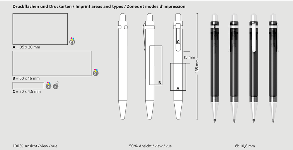 The Icy ice PMs is a Retractable ballpoint pen. Material and surface: Tip: plastic (ABS), silver lacquered. Barrel: plastic (M-ABS) frosted. Clip: spring steel satin chrome. Push button: plastic (ABS), silver lacquered. Standard colours: Barrel: available in 4 colours. Special colours: from 10,000 pcs., without PMS surcharge from 25,000 pcs.. Refill: Icefill (2,000 m), blue, Refill Optional: Silktech L.