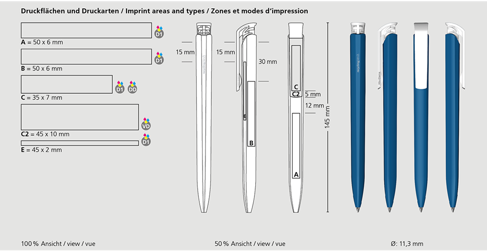 The Trias recycling is a Retractable ballpoint pen. Material and surface: Barrel and push button clip: plastic (rABS) high gloss, recycled. Refill tubes: Recycled polypropylene (rPP). Standard colours: Barrel and push button clip: can be combined in 14 colours. Notice: Due to the use of recycled raw materials, colour deviations can occur in individual components of a product. Special colours: from 3,000 pcs., without PMS surcharge from 25,000 pcs.. Refill: Silktech L (3,000 m), blue or black, Refill Optional: