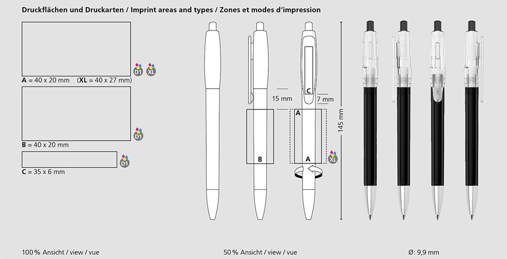 The Klix transparent Mn is a Retractable ballpoint pen. Material and surface: Tip: brass nickel plated. Barrel, upper barrel and push button: plastic (M-ABS) transparent. Refill tubes: Recycled polypropylene (rPP). Standard colours: Barrel, upper barrel and push button: can be combined in 12 colours. Special colours: from 5,000 pcs., without PMS surcharge from 25,000 pcs.. Refill: Silktech L (3,000 m), blue or black, Refill Optional: Silktech XL, Multifill P, Multi-Gel.