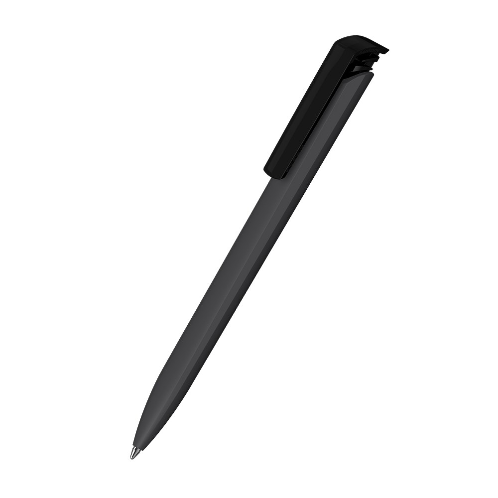 The Trias softtouch/transparent is a Retractable ballpoint pen. Material and surface: Barrel: plastic (ABS), rubberised softtouch surface. Push button clip: plastic (M-ABS) transparent. Refill tubes: Recycled polypropylene (rPP). Standard colours: Barrel and push button clip: can be combined in 14 colours. Special colours: from 5,000 pcs., without PMS surcharge from 25,000 pcs.. Refill: Silktech L (3,000 m), blue or black, Refill Optional: