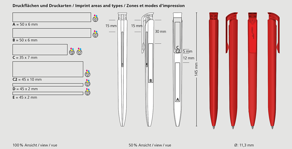 The Trias softtouch/transparent is a Retractable ballpoint pen. Material and surface: Barrel: plastic (ABS), rubberised softtouch surface. Push button clip: plastic (M-ABS) transparent. Refill tubes: Recycled polypropylene (rPP). Standard colours: Barrel and push button clip: can be combined in 14 colours. Special colours: from 5,000 pcs., without PMS surcharge from 25,000 pcs.. Refill: Silktech L (3,000 m), blue or black, Refill Optional: