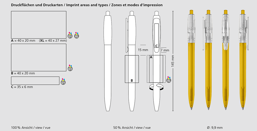 The Klix transparent is a Retractable ballpoint pen. Material and surface: Barrel, upper barrel and push button: plastic (M-ABS) transparent. Refill tubes: Recycled polypropylene (rPP). Standard colours: Barrel, upper barrel and push button: can be combined in 12 colours. Special colours: from 5,000 pcs., without PMS surcharge from 25,000 pcs.. Refill: Silktech L (3,000 m), blue or black, Refill Optional: Silktech XL, Multifill P, Multi-Gel.