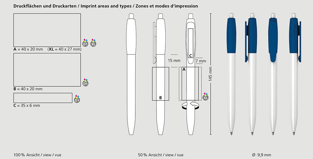 The Klix high gloss is a Retractable ballpoint pen. Material and surface: Barrel, upper barrel and push button: plastic (ABS) high gloss. Refill tubes: Recycled polypropylene (rPP). Standard colours: Barrel, upper barrel and push button: can be combined in 14 colours. Special colours: from 5,000 pcs., without PMS surcharge from 25,000 pcs.. Refill: Silktech L (3,000 m), blue or black, Refill Optional: Silktech XL, Multifill P, Multi-Gel.