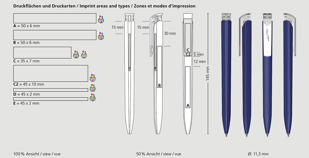 The Trias high gloss/transparent is a Retractable ballpoint pen. Material and surface: Barrel: plastic (ABS) high gloss. Push button clip: plastic (M-ABS) transparent. Refill tubes: Recycled polypropylene (rPP). Standard colours: Barrel: can be combined in 14 colours. Push button clip: can be combined in 12 colours. Special colours: from 5,000 pcs., without PMS surcharge from 25,000 pcs.. Refill: Silktech L (3,000 m), blue or black, Refill Optional: