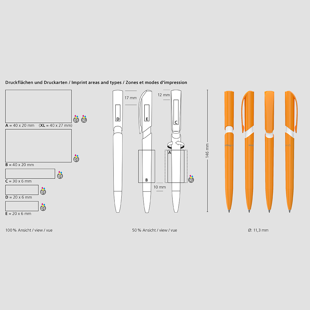 The Push recycling is a Retractable ballpoint pen. Material and surface: Tip, barrel, sleeve and push button clip: plastic (rABS) high gloss, Refill tubes: Recycled polypropylene (rPP). Standard colours: Tip, barrel, sleeve and upper barrel: can be combined in 14 colours. Special colours: from 5,000 pcs., without PMS surcharge from 25,000 pcs.. Refill: Silktech L (3,000 m), blue or black, Refill Optional: Silktech XL, Multifill P, Multi-Gel.