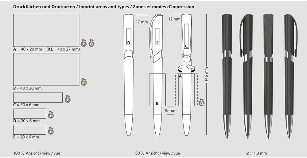 The Push high gloss Mn is a Retractable ballpoint pen. Material and surface: Tip: brass nickel plated. Barrel: plastic (ABS) high gloss. Sleeve: Metallised. Push button clip: plastic (ABS) high gloss. Refill tubes: Recycled polypropylene (rPP). Standard colours: Barrel and upper barrel: can be combined in 14 colours. Special colours: from 5,000 pcs., without PMS surcharge from 25,000 pcs.. Refill: Silktech L (3,000 m), blue or black, Refill Optional: Silktech XL, Multifill P, Multi-Gel.