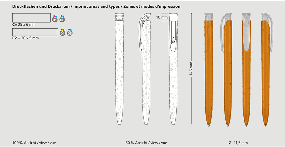 The Jona drops/transparent is a Retractable ballpoint pen. Material and surface: Barrel and push button clip: plastic (M-ABS) transparent, Barrel: structure in drop optic. Refill tubes: Recycled polypropylene (rPP). Standard colours: Barrel and push button clip: can be combined in 4 colours. Special colours: from 5,000 pcs., without PMS surcharge from 25,000 pcs.. Refill: Silktech L (3,000 m), blue or black, Refill Optional: Silktech XL, Multifill P, Multi-Gel.