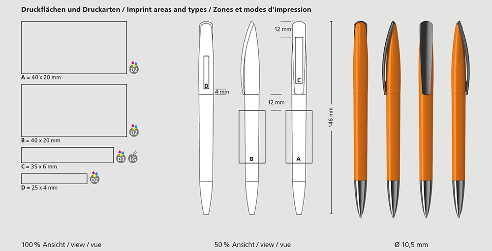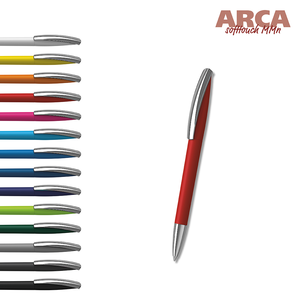 The Arca softtouch MMn is a Twist action ballpoint pen. Material and surface: Tip: brass nickel plated. Barrel and upper barrel: plastic (ABS), rubberised softtouch surface. Clip: spring steel nickel plated. Refill tubes: Recycled polypropylene (rPP). Standard colours: Barrel and upper barrel: can be combined in 14 colours. Special colours: from 5,000 pcs., without PMS surcharge from 25,000 pcs.. Refill: Silktech L (3,000 m), blue or black, Refill Optional: Silktech XL, Multifill P, Multi-Gel.