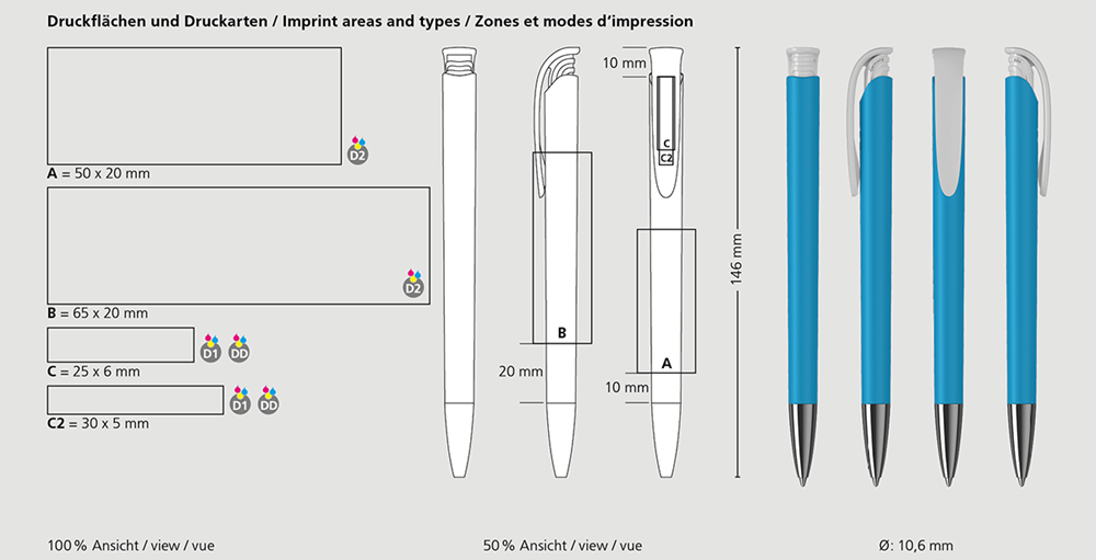 The Jona softtouch/high gloss Mn is a Retractable ballpoint pen. Material and surface: Tip: brass nickel plated. Barrel: plastic (ABS), rubberised softtouch surface. Push button clip: plastic (ABS) high gloss. Refill tubes: Recycled polypropylene (rPP). Standard colours: Barrel and push button clip: can be combined in 14 colours. Special colours: from 5,000 pcs., without PMS surcharge from 25,000 pcs.. Refill: Silktech L (3,000 m), blue or black, Refill Optional: Silktech XL, Multifill P, Multi-Gel.