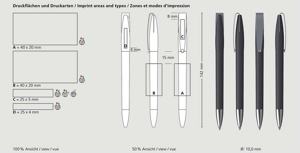 The Cobra softgrip MMs is a Twist action ballpoint pen. Material and surface: Tip: brass satin chrome. Barrel and upper barrel: softgrip lacquered surface. Clip: spring steel satin chrome. Refill tubes: Recycled polypropylene (rPP). Standard colours: Barrel and upper barrel: can be combined in 3 colours. Special colours: - Refill: Silktech L (3,000 m), blue or black, Refill Optional: Silktech XL, Multifill P, Multi-Gel.