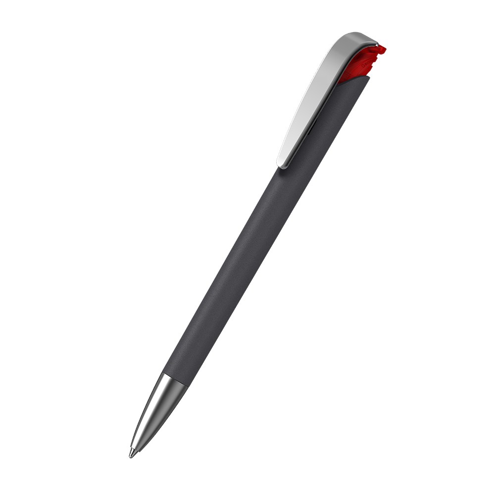 The Jona softgrip/ice MMs is a Retractable ballpoint pen. Material and surface: Tip: brass satin chrome. Barrel: softgrip lacquered surface. Push button: plastic (M-ABS) frosted. Clip: spring steel satin chrome. Refill tubes: Recycled polypropylene (rPP). Standard colours: Barrel: can be combined in 3 colours. Push button: can be combined in 12 colours. Special colours: - Refill: Silktech L (3,000 m), blue or black, Refill Optional: Silktech XL, Multifill P, Multi-Gel.