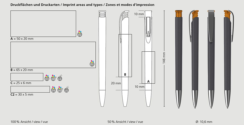 The Jona softgrip/ice MMs is a Retractable ballpoint pen. Material and surface: Tip: brass satin chrome. Barrel: softgrip lacquered surface. Push button: plastic (M-ABS) frosted. Clip: spring steel satin chrome. Refill tubes: Recycled polypropylene (rPP). Standard colours: Barrel: can be combined in 3 colours. Push button: can be combined in 12 colours. Special colours: - Refill: Silktech L (3,000 m), blue or black, Refill Optional: Silktech XL, Multifill P, Multi-Gel.