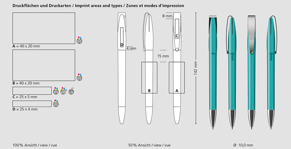 The Cobra softfrost MMn is a Twist action ballpoint pen. Material and surface: Tip: brass nickel plated. Barrel and upper barrel: plastic (M-ABS) transparent, rubberised softfrost surface. Clip: spring steel nickel plated. Refill tubes: Recycled polypropylene (rPP). Standard colours: Barrel and upper barrel: can be combined in 12 colours. Special colours: from 5,000 pcs., without PMS surcharge from 25,000 pcs.. Refill: Silktech L (3,000 m), blue or black, Refill Optional: Silktech XL, Multifill P, Multi-Gel.