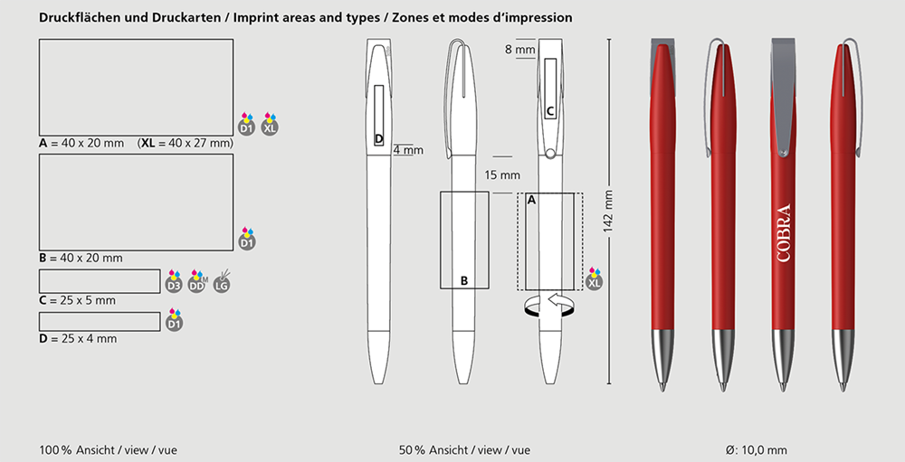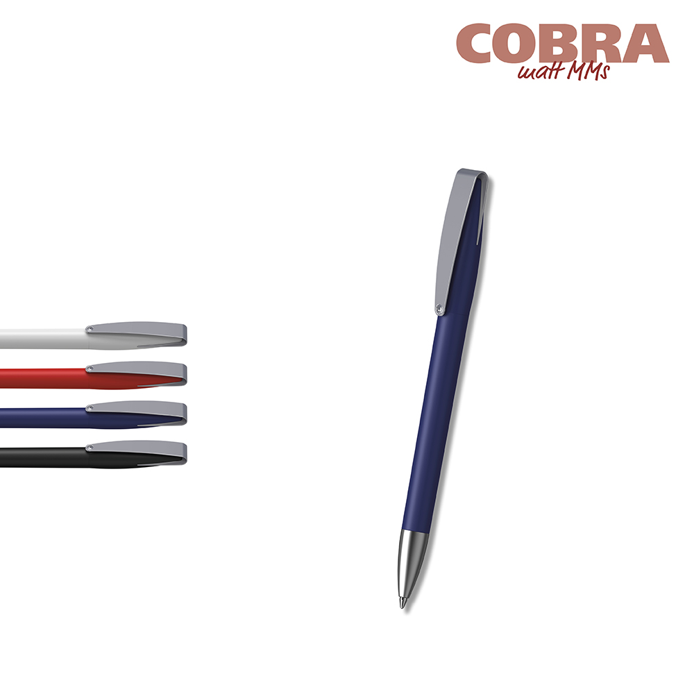 The Cobra matt MMs is a Twist action ballpoint pen. Material and surface: Tip: brass satin chrome. Barrel and upper barrel: plastic (ABS) matt. Clip: spring steel satin chrome. Refill tubes: Recycled polypropylene (rPP). Standard colours: Barrel and upper barrel: can be combined in 4 colours. Special colours: from 5,000 pcs., without PMS surcharge from 25,000 pcs.. Refill: Silktech L (3,000 m), blue or black, Refill Optional: Silktech XL, Multifill P, Multi-Gel.