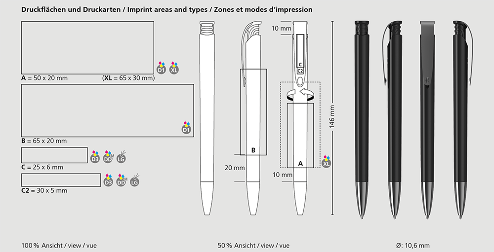 The Jona high gloss MMn is a Retractable ballpoint pen. Material and surface: Tip: brass nickel plated. Barrel and push button: plastic (ABS) high gloss. Clip: spring steel nickel plated. Refill tubes: Recycled polypropylene (rPP). Standard colours: Barrel and push button: can be combined in 14 colours. Special colours: from 5,000 pcs., without PMS surcharge from 25,000 pcs.. Refill: Silktech L (3,000 m), blue or black, Refill Optional: Silktech XL, Multifill P, Multi-Gel.