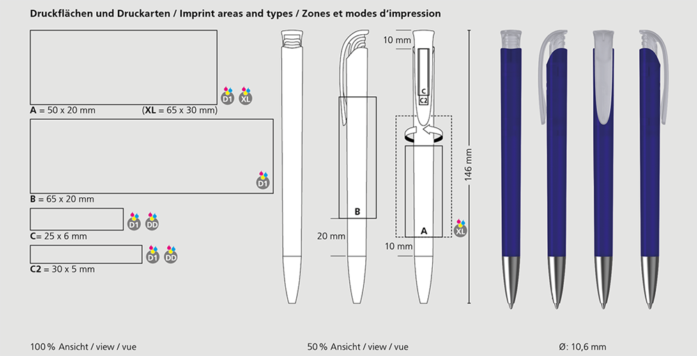 The Jona ice Ms is a Retractable ballpoint pen. Material and surface: Tip: brass satin chrome. Barrel and push button clip: plastic (M-ABS) frosted. Refill tubes: Recycled polypropylene (rPP). Standard colours: Barrel and push button clip: can be combined in 12 colours. Special colours: from 5,000 pcs., without PMS surcharge from 25,000 pcs.. Refill: Silktech L (3,000 m), blue or black, Refill Optional: Silktech XL, Multifill P, Multi-Gel.