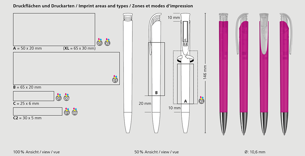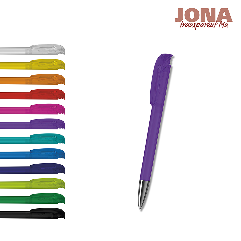 The Jona transparent Mn is a Retractable ballpoint pen. Material and surface: Tip: brass nickel plated. Barrel and push button clip: plastic (M-ABS) transparent. Refill tubes: Recycled polypropylene (rPP). Standard colours: Barrel and push button clip: can be combined in 12 colours. Special colours: from 5,000 pcs., without PMS surcharge from 25,000 pcs.. Refill: Silktech L (3,000 m), blue or black, Refill Optional: Silktech XL, Multifill P, Multi-Gel.