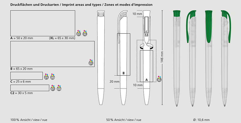 The Jona ice is a Retractable ballpoint pen. Material and surface: Tip, barrel and push button clip: plastic (M-ABS) frosted. Refill tubes: Recycled polypropylene (rPP). Standard colours: Tip, barrel and push button clip: can be combined in 12 colours. Special colours: from 5,000 pcs., without PMS surcharge from 25,000 pcs.. Refill: Silktech L (3,000 m), blue or black, Refill Optional: Silktech XL, Multifill P, Multi-Gel.