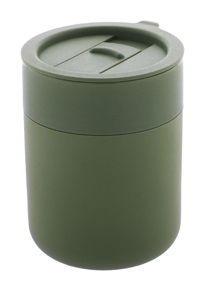 Silicone covered ceramic travel cup with PP plastic drinking lid. 300 ml. more