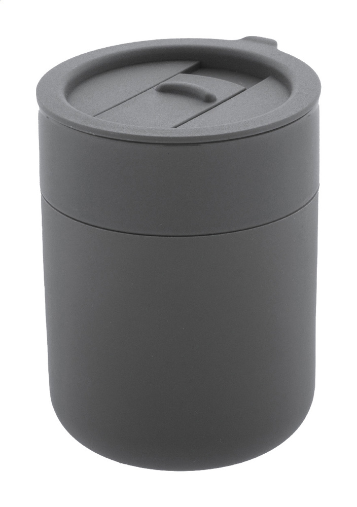 Silicone covered ceramic travel cup with PP plastic drinking lid. 300 ml. more