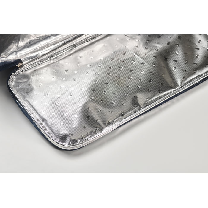 Picnic cooler bag in 600D RPET polyester for 2 people with zippered front pocket including stainless steel cutlery, 2 plates in PS, 2 glasses in PS and 2 cotton napkins. Capacity: 18l