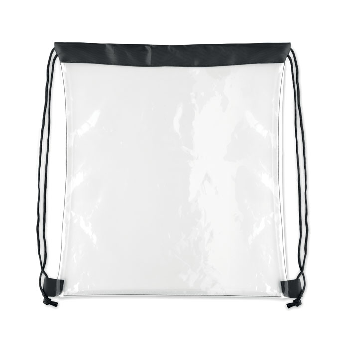 Transparent drawstring bag in EVA and PVC. Polyester cords.