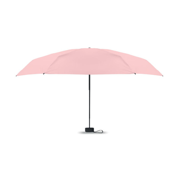 19-inch 5-fold manual umbrella made of 190T pongee with matching pouch. It has a metal and fibreglass windproof frame, black rubberized handle with wrist strap, and compact 17 cm folded size.
