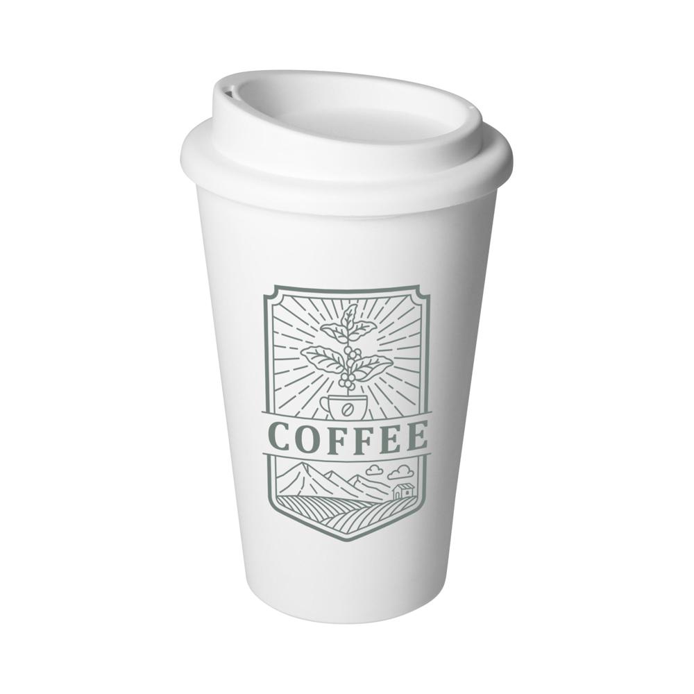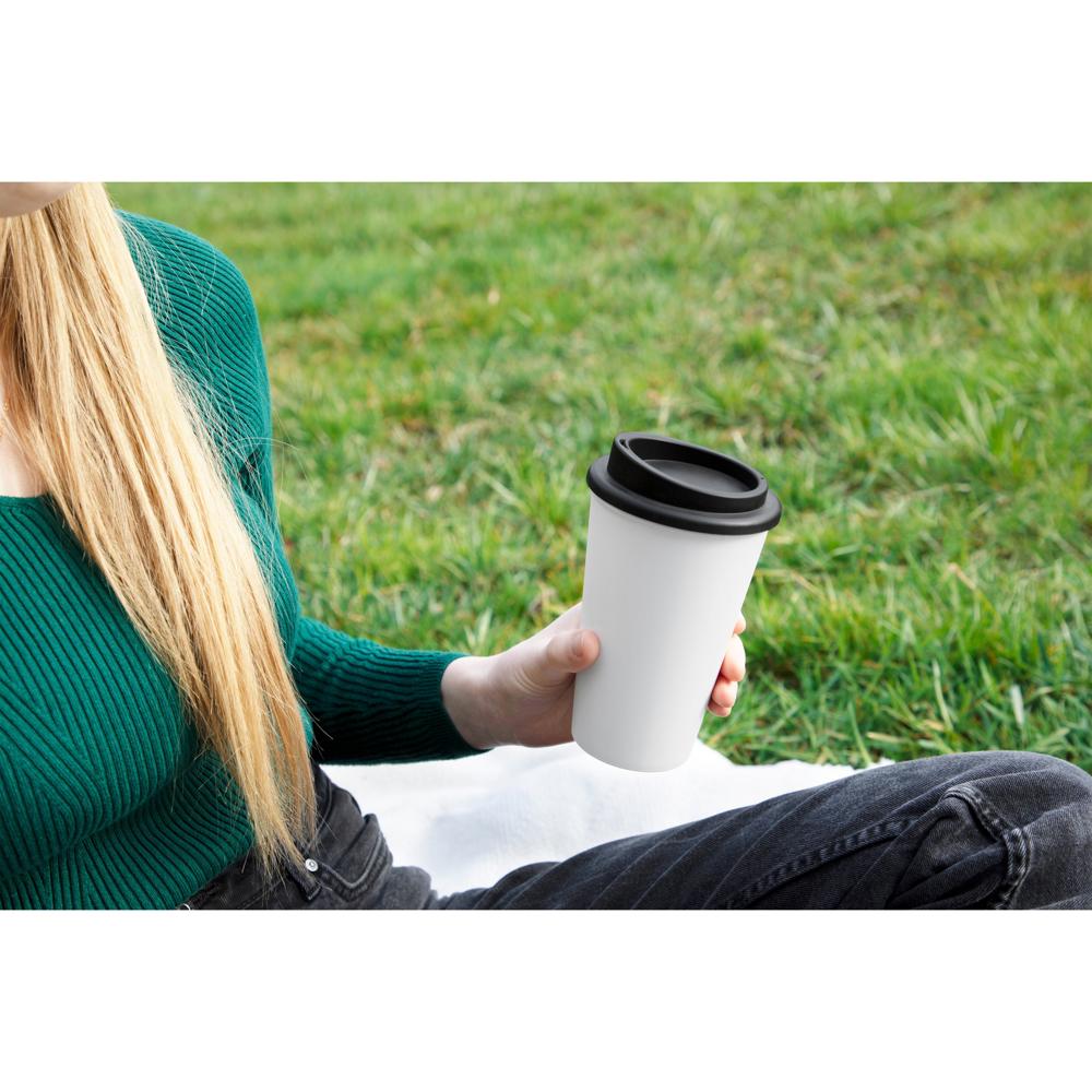 For the coffee to go. Useful to-go mug made from double-walled plastic incl. lid with drinking opening. The lid is screwable and therefore is particularly tight on the mug. Capacity: 0.35 litres.