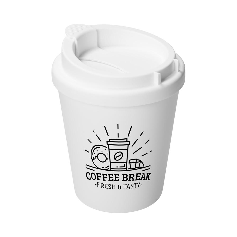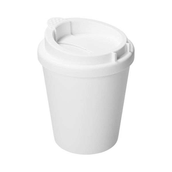 A compact double walled to go mug made out of plastic. It includes an attachable lid with an opening for drinking. The mug can be closed with the flexible lashes that are on the side. The lashes can also be fastened to the rim of the mug. The mug fits in all standard cup holders. Capacity: 0,25 Liters.