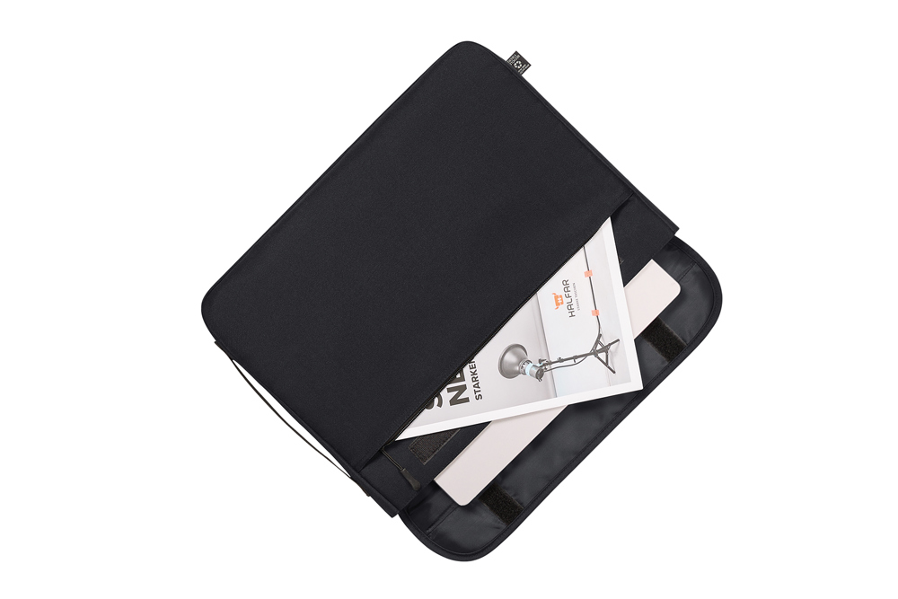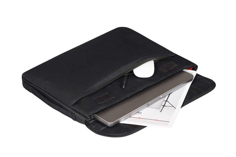 elegant laptop sleeve made of recycled fabric; padded main compartment; padded flap with hook-and-loop fastener; large front pocket with zipper; inner AirTag compartment; back loops for attaching individual accessories, e.g. shoulder strap (not included); ergonomic rear handle, also suitable for fastening to trolley bar; flat side handle for easy lifting, e.g. from backpacks