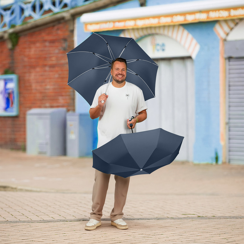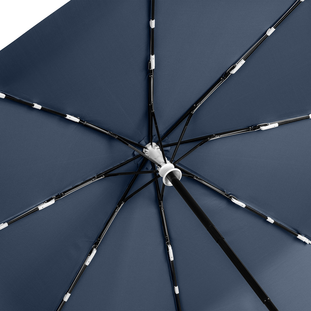 Stylish automatic open/close pocket umbrella with white design elements Convenient automatic open/close function for quick opening and closing, high-quality Windproof PLUS system for maximum frame flexibility in strong gusts of wind, flexible fibreglass ribs with white design elements, robust steel shaft, polyester pongee cover material made from recycled plastics, attractive soft-feel handle with carrying strap in the cover colour and white design elements with integrated push-button and promotional labelling option