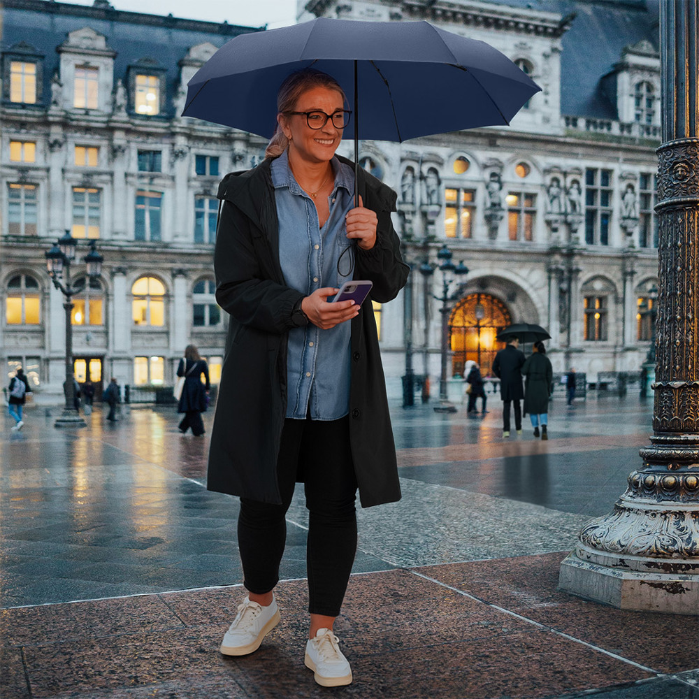 Compact manual opening pocket umbrella with excellent value for money and Windproof PLUS system Easy to use thanks to safety runner, high-quality Windproof PLUS system for maximum frame flexibility in strong gusts of wind, soft-feel handle with elastic carrying strap and promotional labelling option