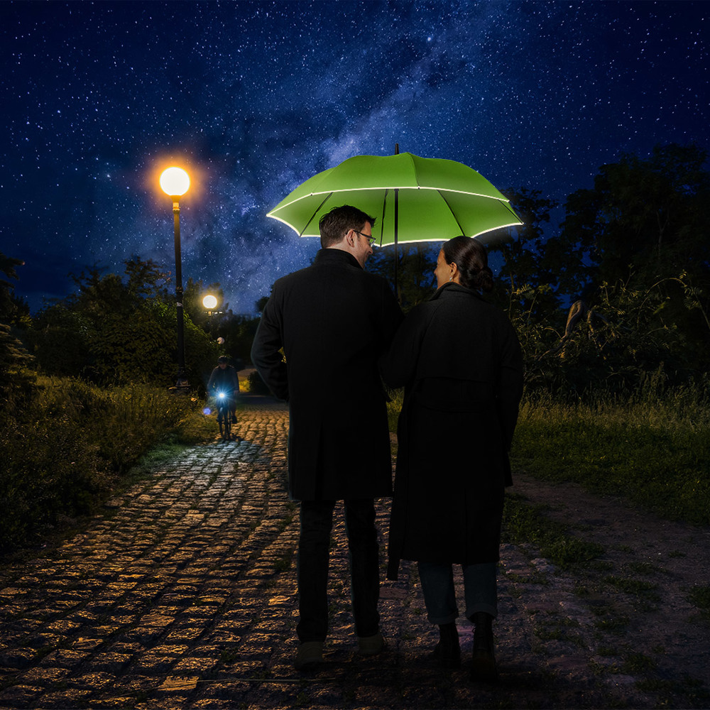 Smart medium-sized regular umbrella with fashionable reflective piping Convenient automatic function for quick opening, high-quality Windproof PLUS system for maximum frame flexibility in strong gusts of wind, flexible fibreglass ribs, robust black galvanised steel shaft, cover with stylish silver reflective piping, polyester pongee cover material made from recycled plastics, environmentally friendly thanks to original waterSAVE® cover material, with waterSAVE® label on the closing bar, soft-feel crook handle with promotional labelling option