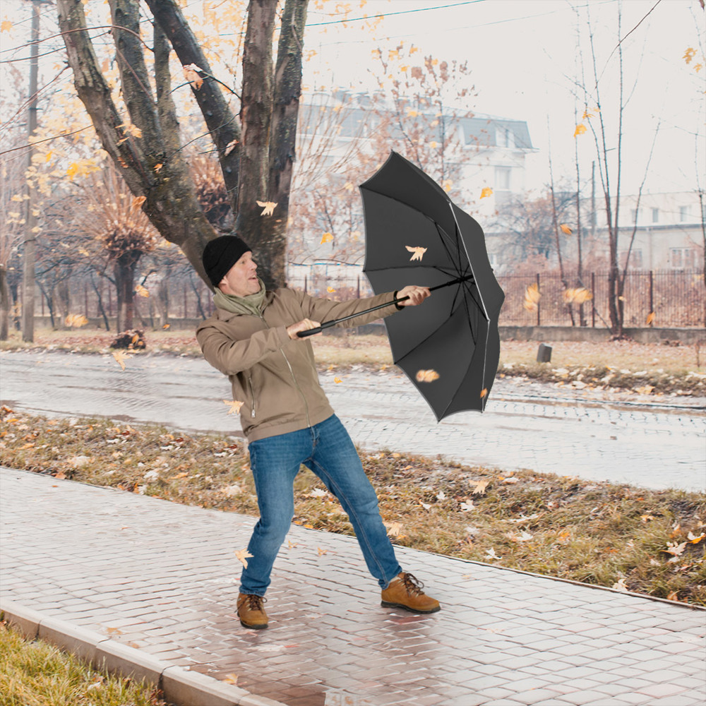 Smart medium-sized regular umbrella with fashionable reflective piping Convenient automatic function for quick opening, high-quality Windproof PLUS system for maximum frame flexibility in strong gusts of wind, flexible fibreglass ribs, robust black galvanised steel shaft, cover with stylish silver reflective piping, polyester pongee cover material made from recycled plastics, environmentally friendly thanks to original waterSAVE® cover material, with waterSAVE® label on the closing bar, soft-feel crook handle with promotional labelling option