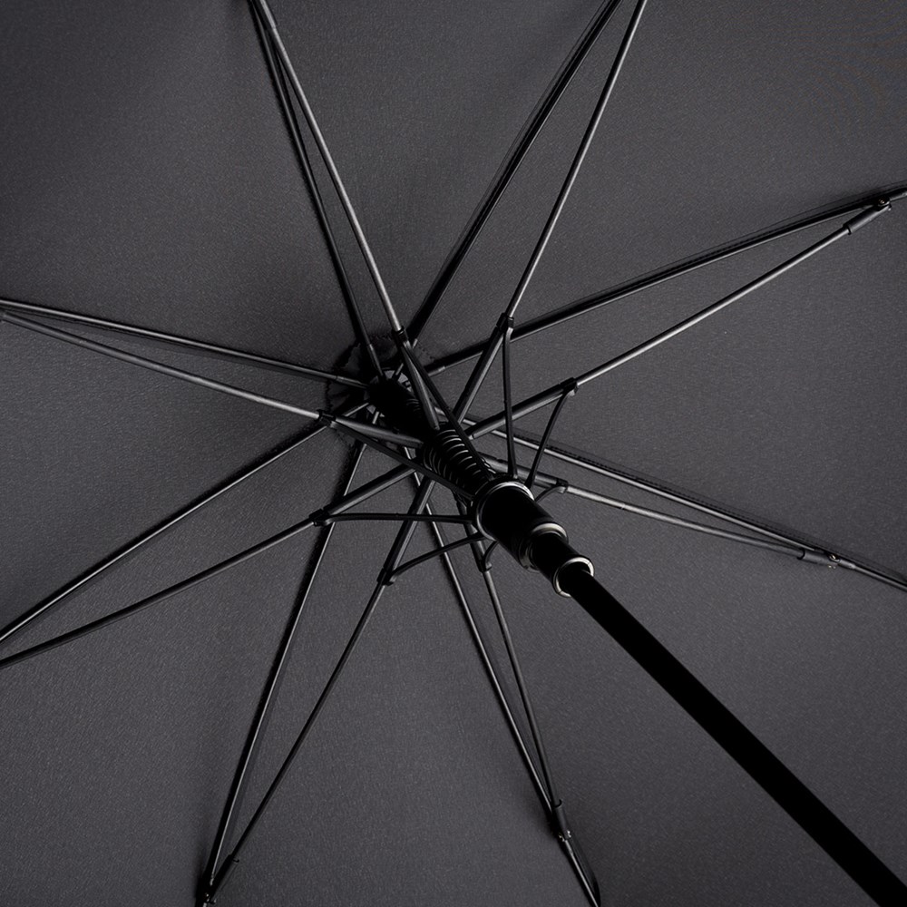 Sporty regular umbrella in medium size with exclusive gear stick handle Convenient automatic function for a quick opening, high-quality Windproof PLUS system for maximum frame flexibility in stormy conditions, flexible fibreglass ribs, water-saving coloured polyester pongee waterSAVE® cover material made from recycled plastics, with waterSAVE® label on the closing strap, dull silver gear stick handle with promotional labelling option (f. e. shifting gate), handle with special finish parts and integrated push button, higher corrosion protection due to galvanized steel shaft. Also available as mini umbrella (art. 5655).