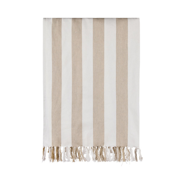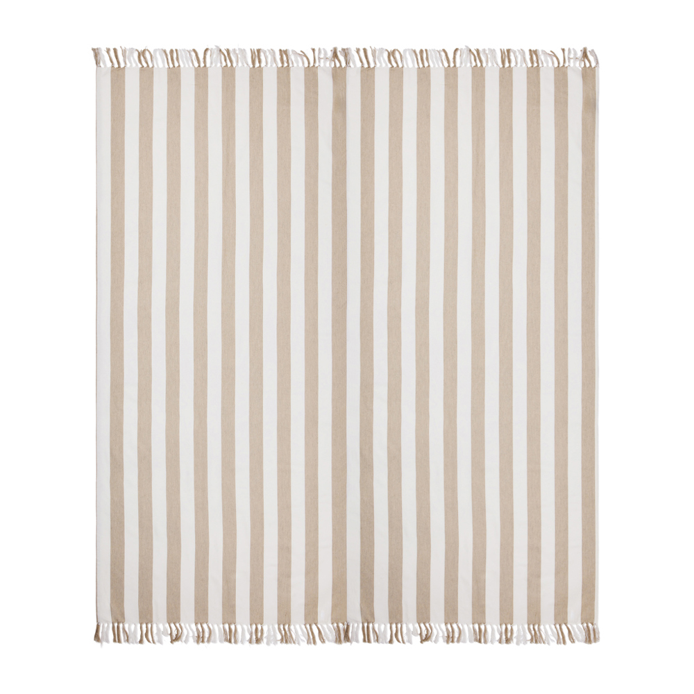 This family hammam beach towel features a classic two-colored striped pattern with fringes on the short sides. With its generous 180×180 cm, it’s perfect for sharing with loved ones, whether you’re relaxing at the beach or lounging by the pool. Crafted from a lightweight and airy 200 gsm blend, it combines the comfort of cotton with the quick-drying benefits of polyester. Certified by GRS (Global Recycled Standard), GRS certification guarantees that the entire supply chain of the recycled materials is certified. The total recycled content is based on the overall product weight. This product contains 70% GRS certified recycled cotton and 29% GRS certified recycled polyester.