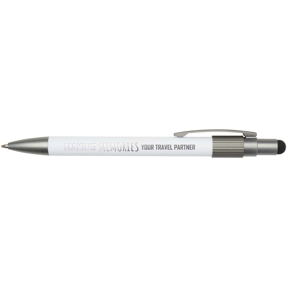 Ballpoint pen with stylus and fidget spinner, combining practicality with a playful design. The pen is made from RCS certified recycled aluminium and features a smooth push mechanism and a stylus tip for touchscreen use. A built-in fidget spinner on top adds a stress-relieving touch (just flick to activate). Pen ink colour: blue. Writing length: 1000 metres.