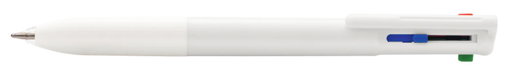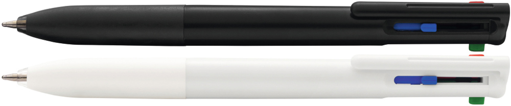 Four-colour ballpoint pen with black, red, blue and green inks, featuring a rubber grip zone. Solid-coloured barrel with coloured sliders matching each ink colour.