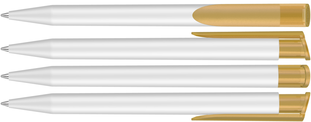 Retractable ballpoint pen with opaque matt housing in white and coloured transparent frosted clip button.