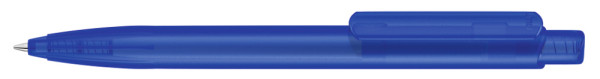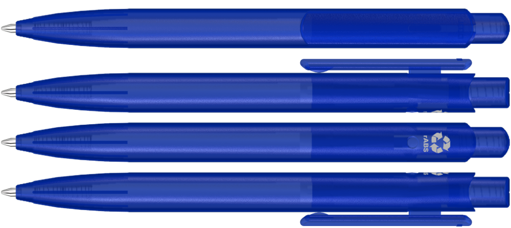 Retractable ballpoint pen with transparent frosted housing, clip and push-button made from recycled ABS plastic. Integrated grip zone.