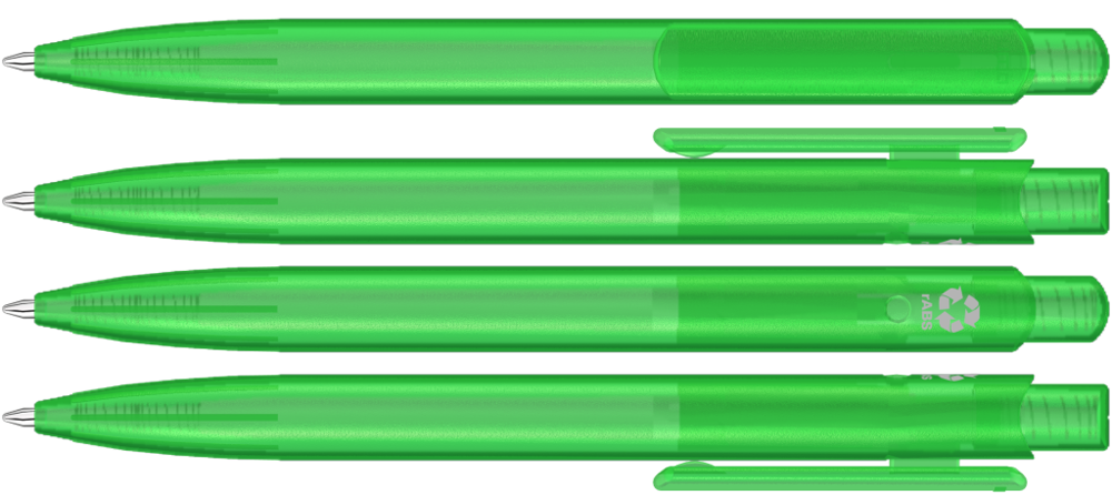 Retractable ballpoint pen with transparent frosted housing, clip and push-button made from recycled ABS plastic. Integrated grip zone.
